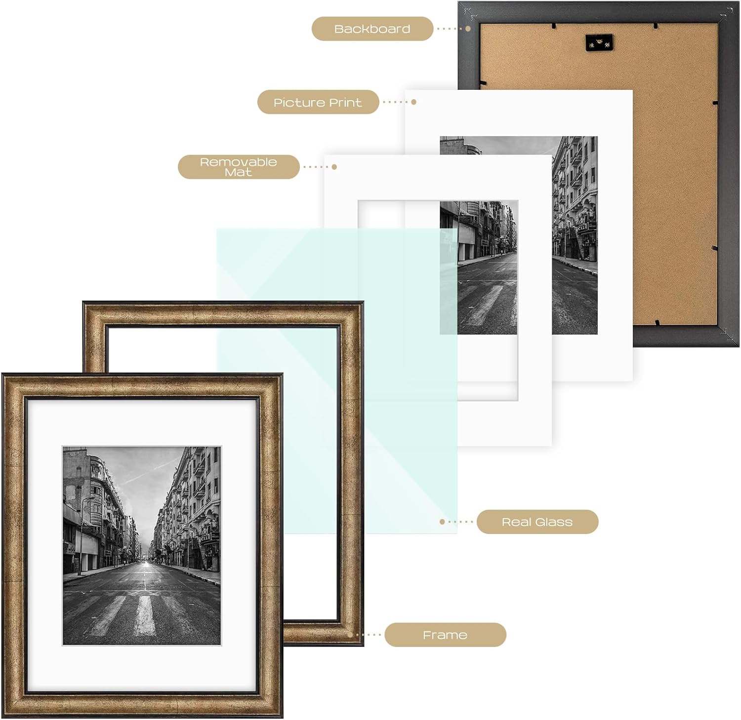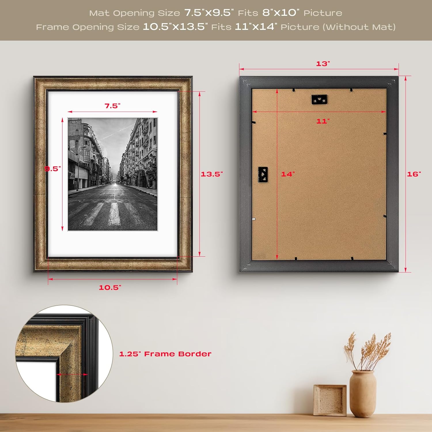 Golden State Art, 11×14 Photo Frame with Mat for Pictures 8×10 and Real Glass (Dark Gold Brown & Bronze Pewter Panel with White Color Mat, 1.25 Inch Frame Border)