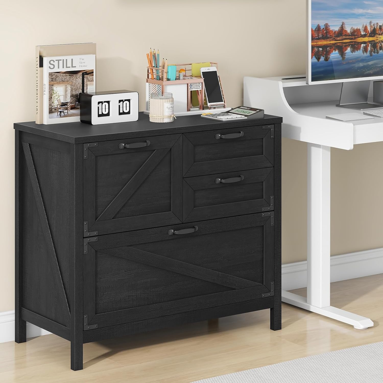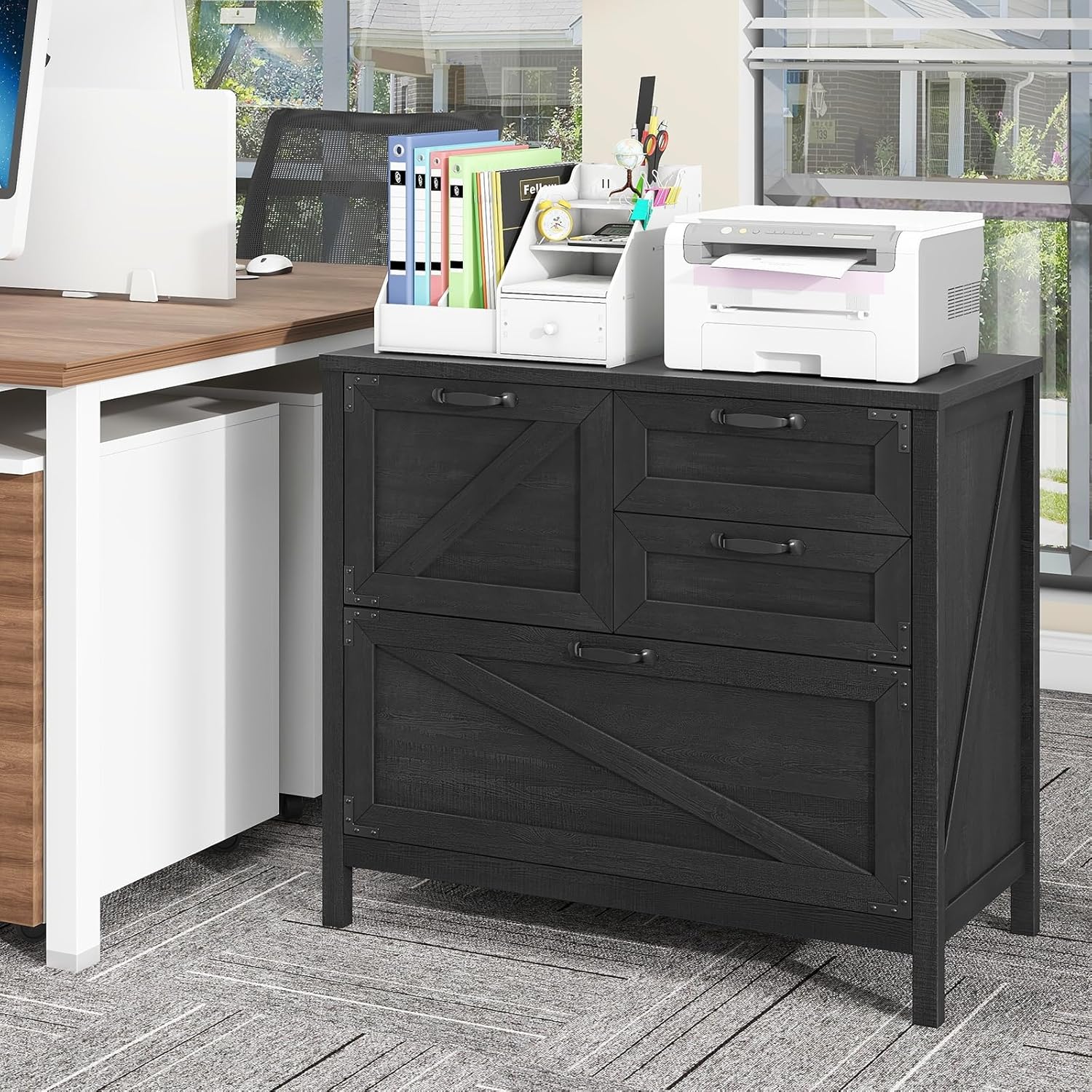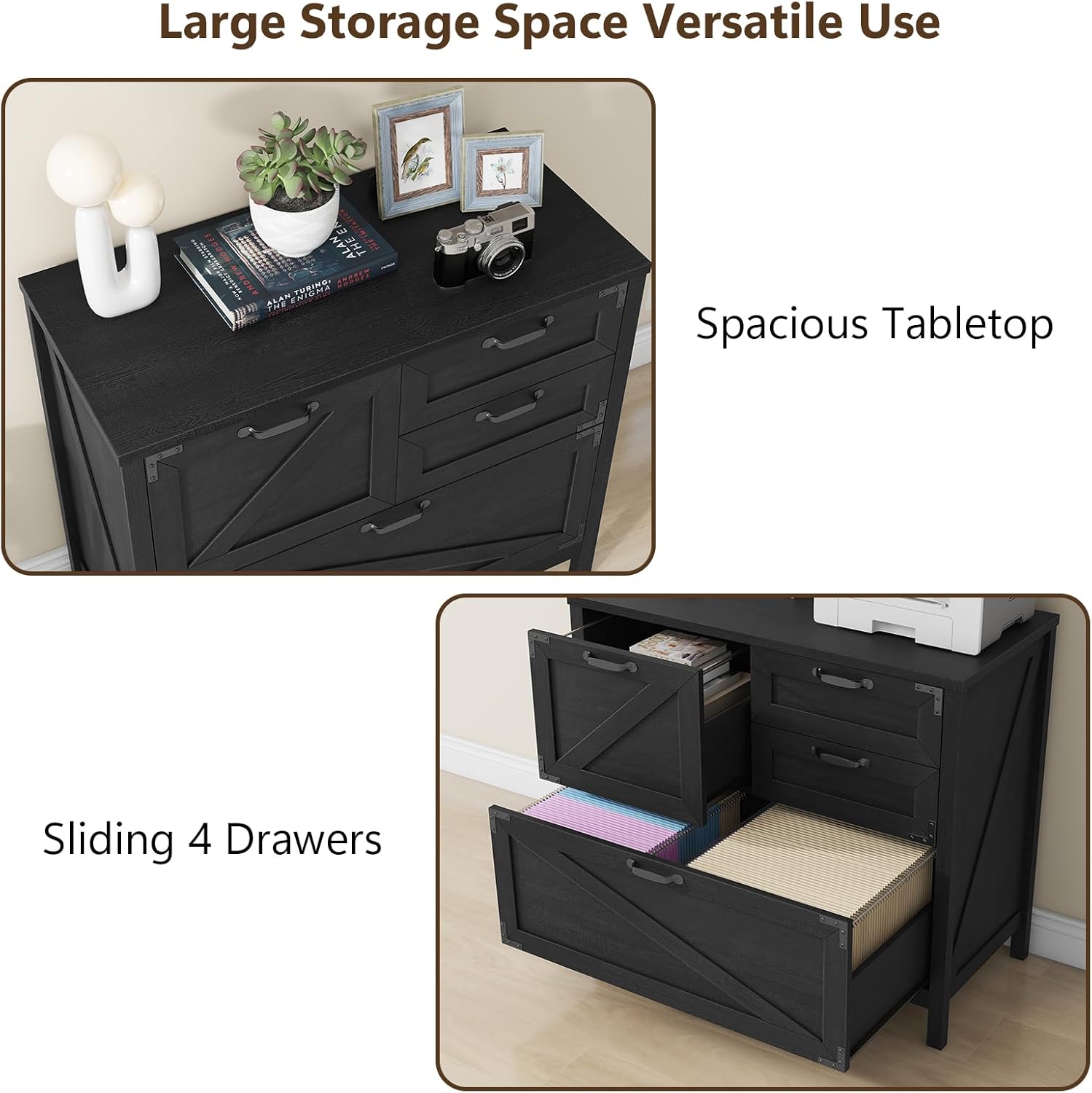 Lateral File Cabinet with 4 Drawers, Farmhouse File Cabinet for Letter/Legal/A4 Size Hanging Files, Large Wood File Storage Cabinets Printer Stand for Home Office Cabinets, Black