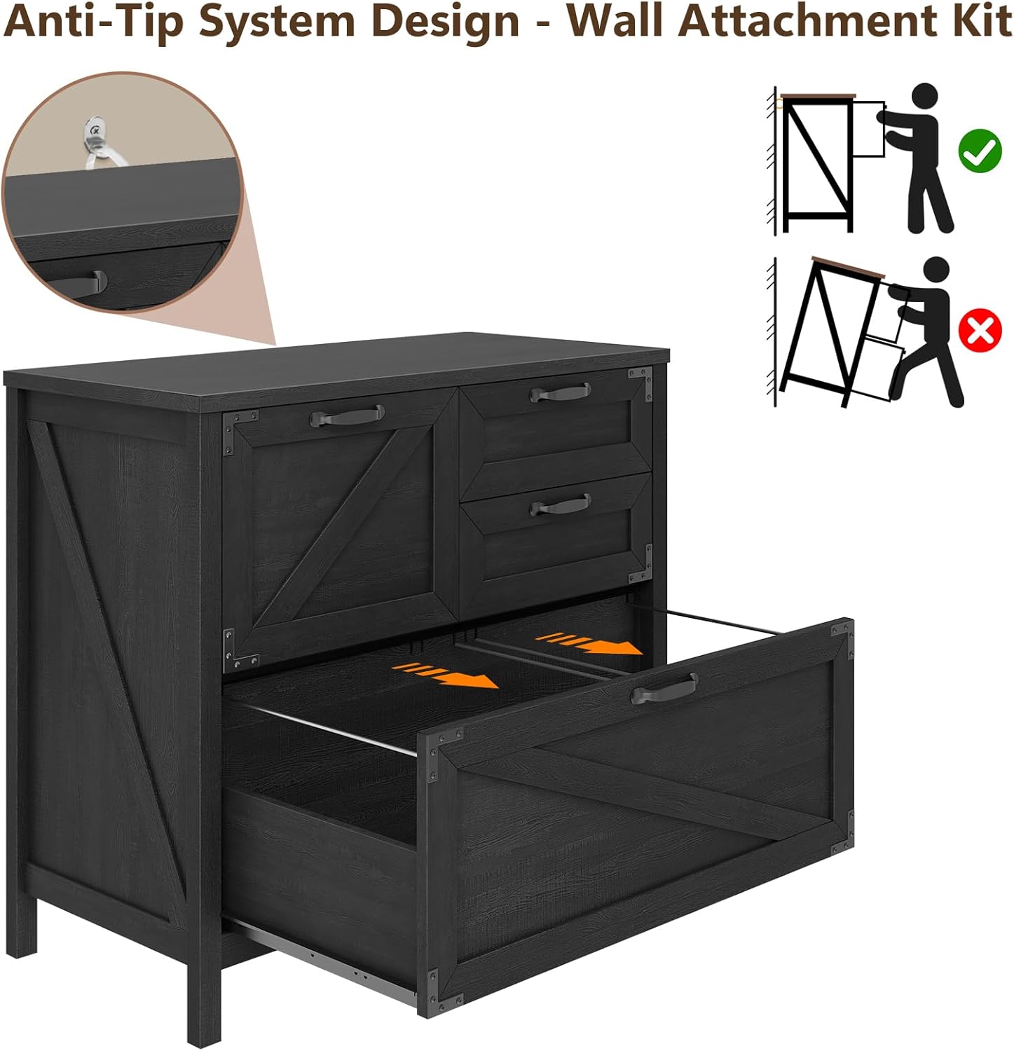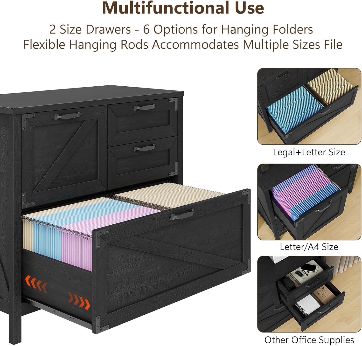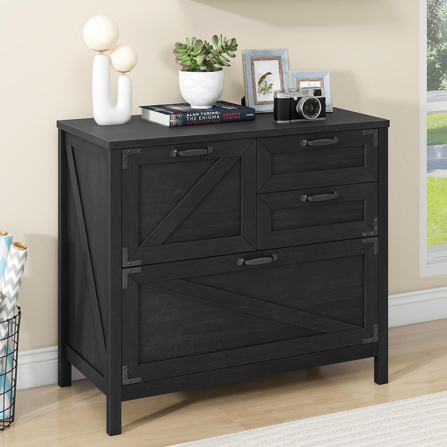 Lateral File Cabinet with 4 Drawers, Farmhouse File Cabinet for Letter/Legal/A4 Size Hanging Files, Large Wood File Storage Cabinets Printer Stand for Home Office Cabinets, Black